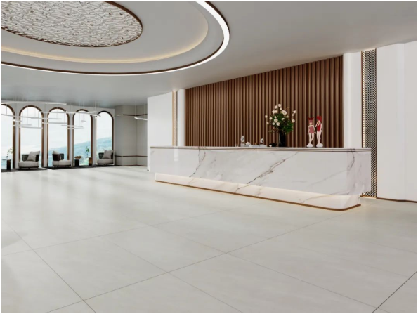 滿牆落地窗仿佛打破了室內與戶外的界限,微泛光芒的地麵在陽光的照射下更顯耀眼,呈現出一種簡約而不簡單的時尚高級感。