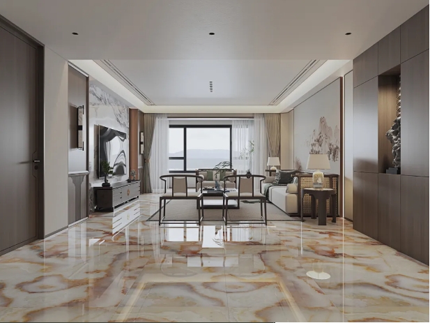 【瑪吉特】整體大麵積上牆鋪地,打造出大氣磅礴的視覺張力,搭配新中式風格的家居軟裝,將高級與優雅平衡融入,盡顯居者不俗