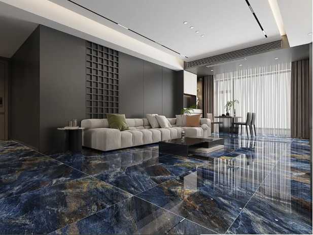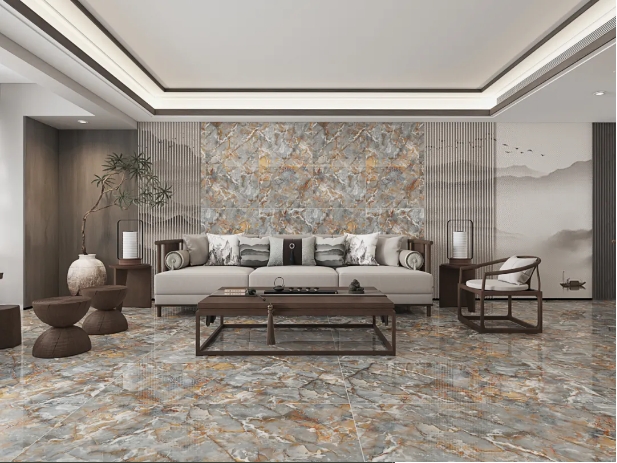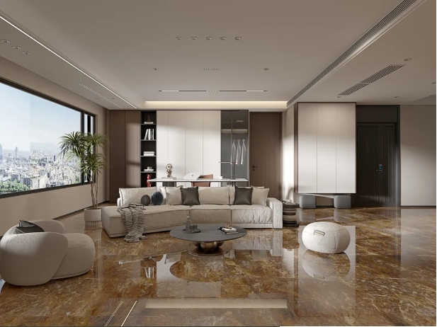 客廳選用【密爾沃】通鋪於地麵,以灰色為客廳的主調,恣意流淌的精致紋理,與窗外陽光交織互動,呈現高級、沉穩的雅致氛圍。