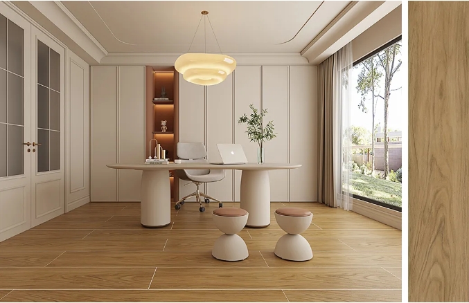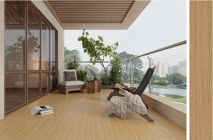 當陽光在年輪裏釀出琥珀色,瓷木印象用瓷磚複刻時光的筆觸——天然原木的呼吸感在磚麵舒展,每一寸肌理都在講述森林的史詩。